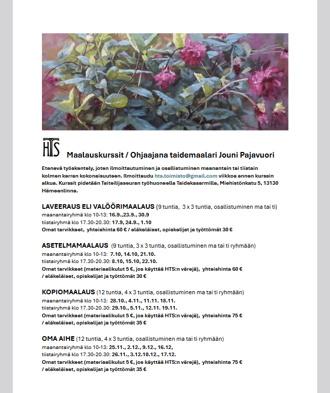 Katso: Jounin ohjaamien maalauskurssien 16.9- 17.12.2024 sisältökuvaukset ja materiaalit.