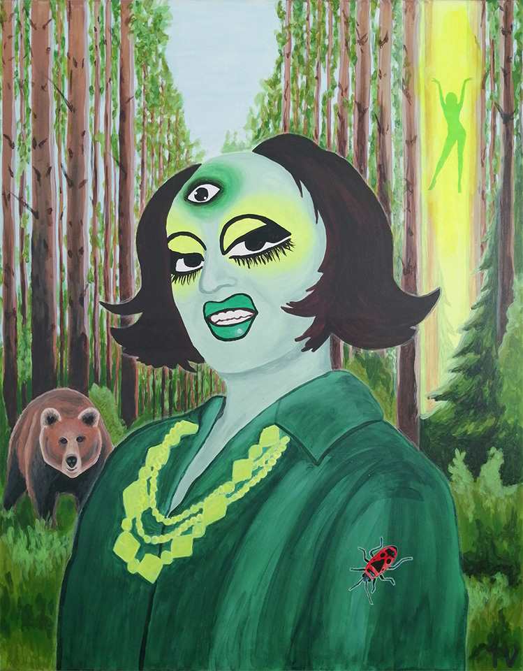 Tällä hetkellä työskentelen Queer Witches maalausten parissa ja maalaan muotokuvia henkisistä queer ihmisistä. Näyttelyitä on ollut jo Madridissa, Seinäjoella ja Helsingissä. Tuotin Eye-Leen omakuvamaaluksiini perustuvaa kangasta yhteistyönä Jani Maunulan kanssa ja kankaasta tehdään installaatioita ja performanssiasuja tuleviin näyttelyihini.